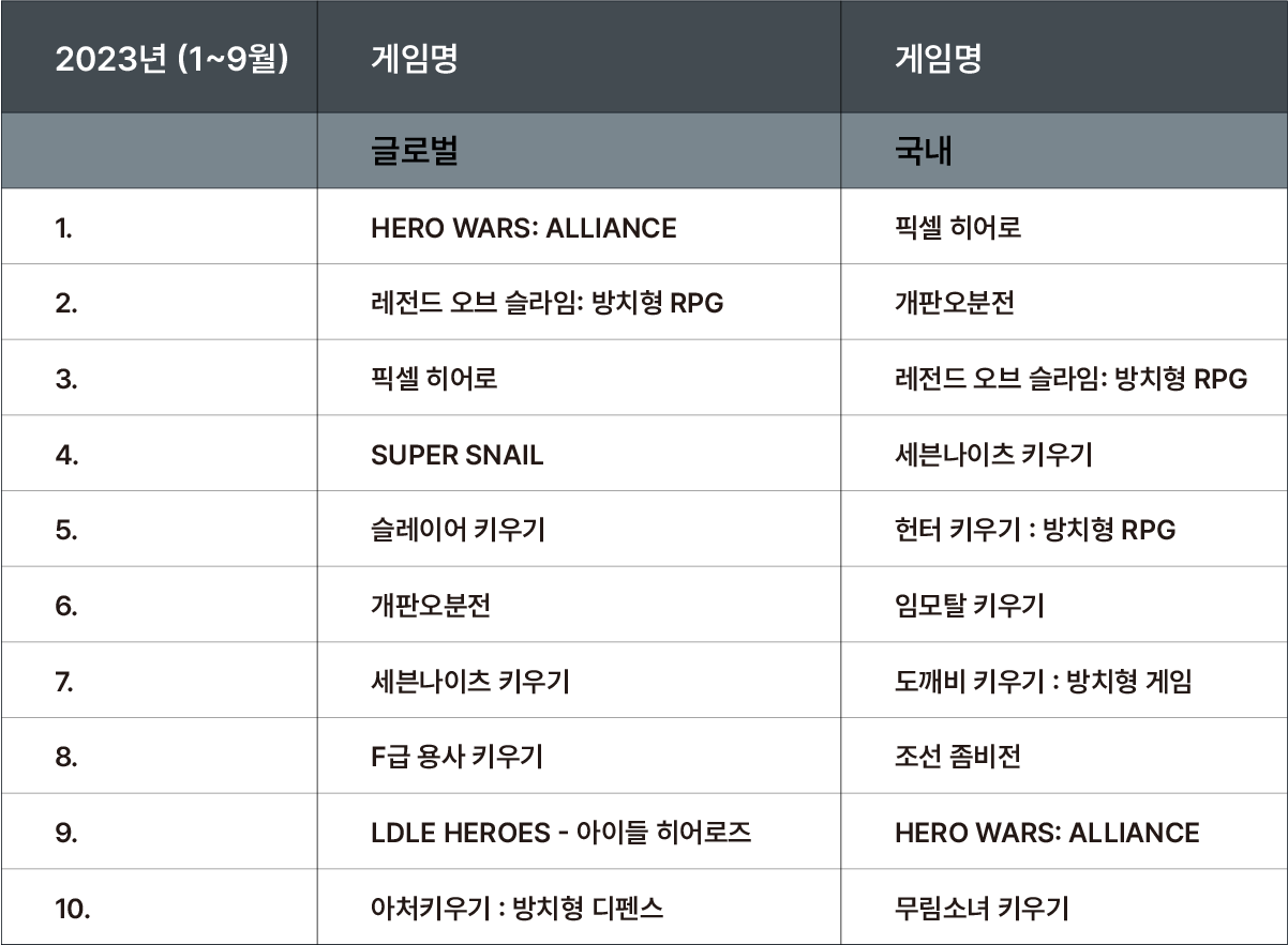 이 표는 2023년 1월부터 9월까지의 인기 게임들을 정리한 것입니다. 글로벌 게임으로는 "HERO WARS: ALLIANCE"와 "SUPER SNAIL"이 있으며, 국내 게임으로는 "픽셀 히어로"와 "도깨비 키우기: 방치형 게임"이 있습니다. 이러한 게임들은 각각의 독특한 매력으로 많은 유저들에게 인기를 끌었습니다.